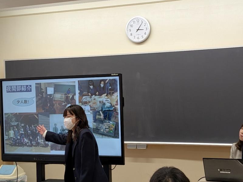 本校の特色の説明後、茎崎中学校出身の夜間部生徒が、夜間部の生活や部活動、中学校との違い、茎崎高校に入学してよかったと思うことについて説明しました。